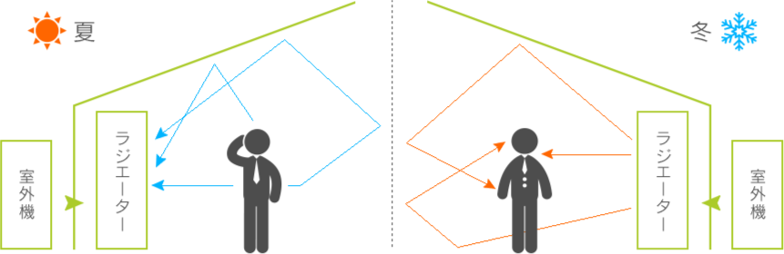 冬はラジエーターから人へ熱が移動し快適な空間を保ちます。